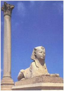 El Serapeum, el templo más destacado del dios greco-egipcio Serapis, se encontraba en el barrio de Rakhotis. Inscripciones bilingües datan su fundación en el reinado de Ptolomeo III Evergetes I. Las ruinas que quedan, incluida la famosa “columna de Pompeyo” del reinado de Diocleciano, proceden principalmente de los primeros siglos de la era cristiana, aunque incorporando mucos elementos del Egipto faraónico, sobre todo esfinges y otras grandes esculturas, cuya función primordial parece que era la de enmarar el escenario. Objetos similares y numerosas otras piezas menores no hay duda de que se exportaron a través de Alejandría con destino a los templos romanos de Serapis e Isis, o a los terrenos de la villa de Adriano en Tívoli y del palacio de Diocleciano en Split. Los monumentos en los que fueron colocados no respondían a un estilo egipcio.